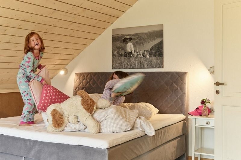 Umgeben von blühenden Feldern, duftenden Weinbergen und märchenhaften Schlössern habt ihr die Qual der Wahl zwischen insgesamt 16 gemütlichen Möglichkeiten: 4 Chalets mit atemberaubendem Blick ins Mittelrheintal, 2 Chalets mit Blick auf Wiesen und Felder, 2 Wellness-Ferienwohnungen, 6 ökologische Holz-Häuser und 2 gemütliche Wohnungen im Haupthaus. Sämtliche Unterkünfte sind perfekt für Familien eingerichtet (und haben teilweise sogar ihre eigene Privat-Sauna). Die Kleinkind-Ausstattung liest sich übrigens wie die Einkaufsliste für’s Erstgeborene, es ist wirklich alles da.