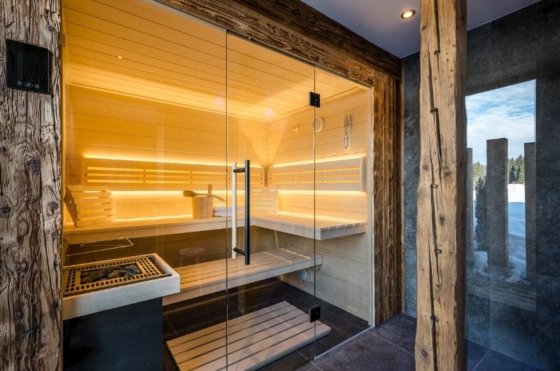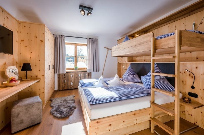 Viel Altholz aus ehemaligen Stadln, Wellnessbadezimmer mit alter Werkbank als Design-Waschbecken, großzügige finnische Privatsauna (eine der Wohnungen hat sogar eine Hot Tub auf der Terrasse), Massage-Anwendungen direkt bei euch in der Wohnung, Balkon oder großzügige Sonnenterrasse mit Relaxliegen und im separaten Kinderzimmer sind coole Etagenbetten, wo bis zu 3 Kinder schlafen können.