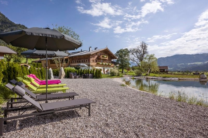Umrahmt von grünen Wiesen, einem schillernden Natur-Biotop zum Planschen und der atemberaubenden Kulisse der Kitzbüheler Alpen befinden sich die Familien-Luxus-Chalets und kinderfreundlichen Ferienwohnungen des Narzenhofs.