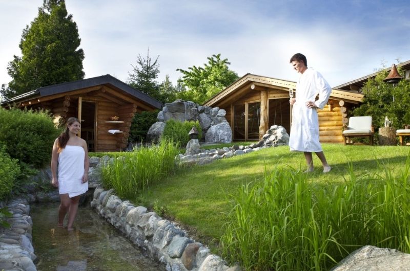 Innenspabereich mit handgemachten Saunen wie eine 90 Grad-Sauna, Sanarium, Solegrotte, Infrarotkabine, Bachlauf mit Wasserfall, Felsenduschen und Ruhebereich.