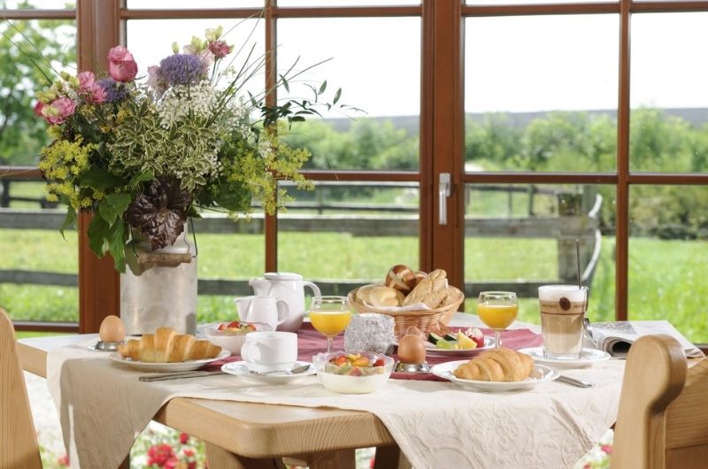 Morgens genießt ihr das fulminante Frühstücksbuffet in Bio-Qualität mit Allgäuer Käse, hausgemachter Wurst, frischem Obst, Brot aus dem eigenen Holzofen, etc. Besonders beliebt bei den Kids: die Panoramafensterplätze mit Blick in die Reithalle, wo ihr bei Müsli und Latte Macchiato die ersten Pferdchen des Tages beobachten könnt.